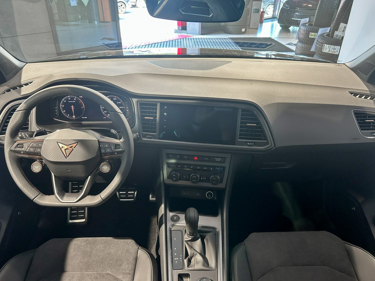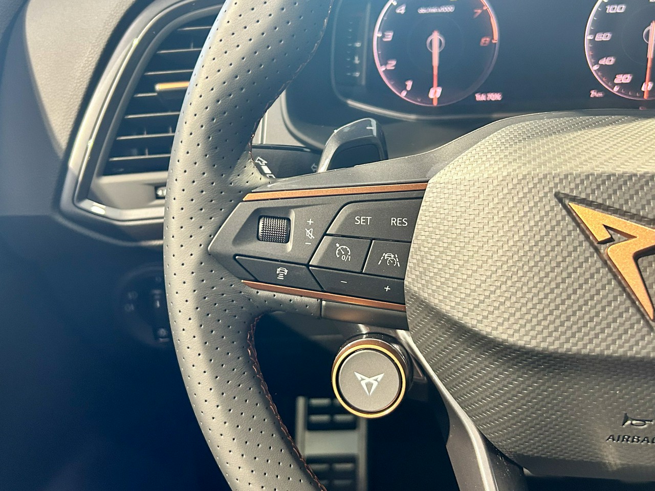 - Sportowa, podgrzewana kierownica wielofunkcyjna obszyta skórą z przyciskiem trybu Cupra i przyciskiem uruchamiania silnika