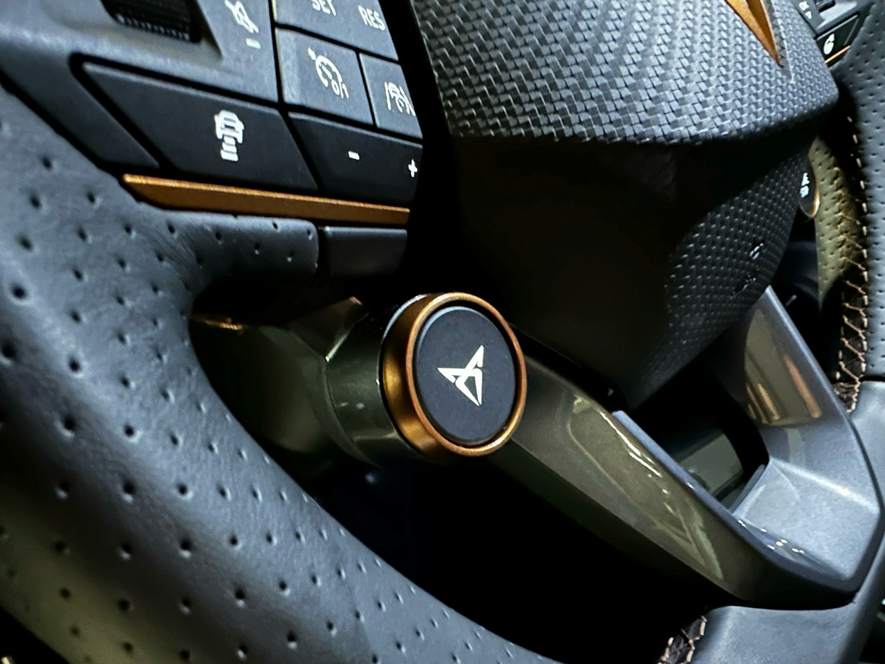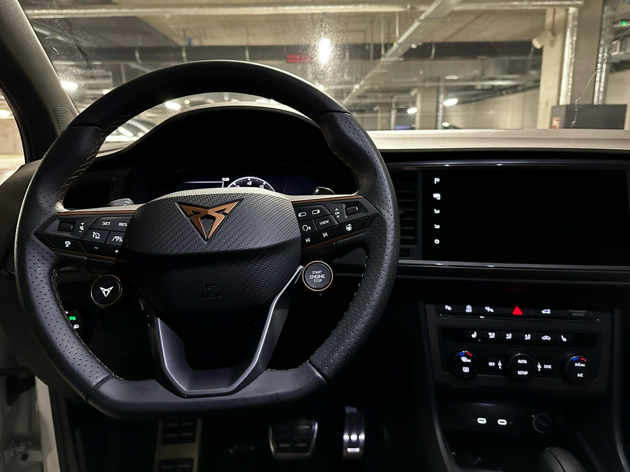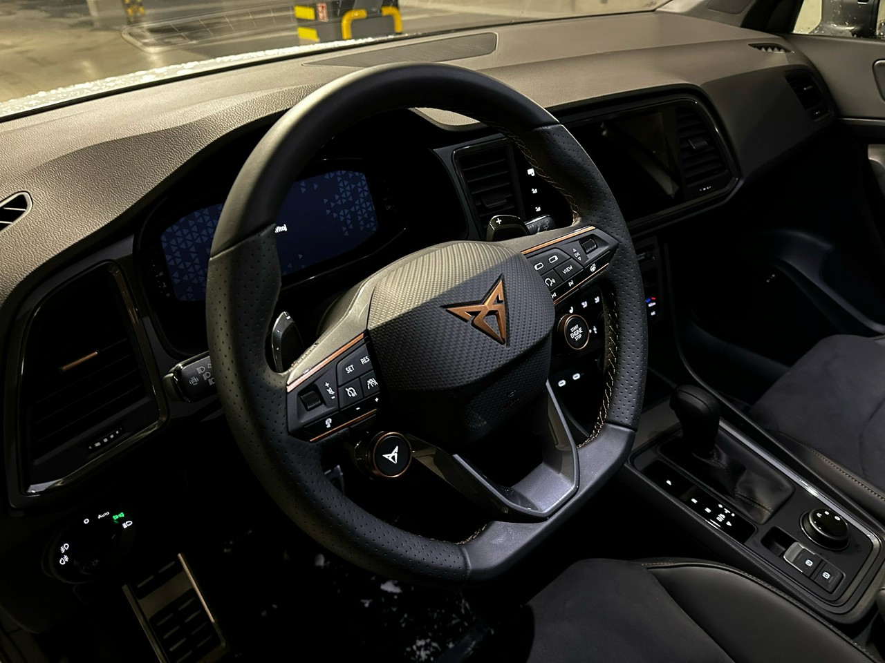 - Sportowa, podgrzewana kierownica wielofunkcyjna obszyta skórą z przyciskiem trybu Cupra i uruchamiania silnika