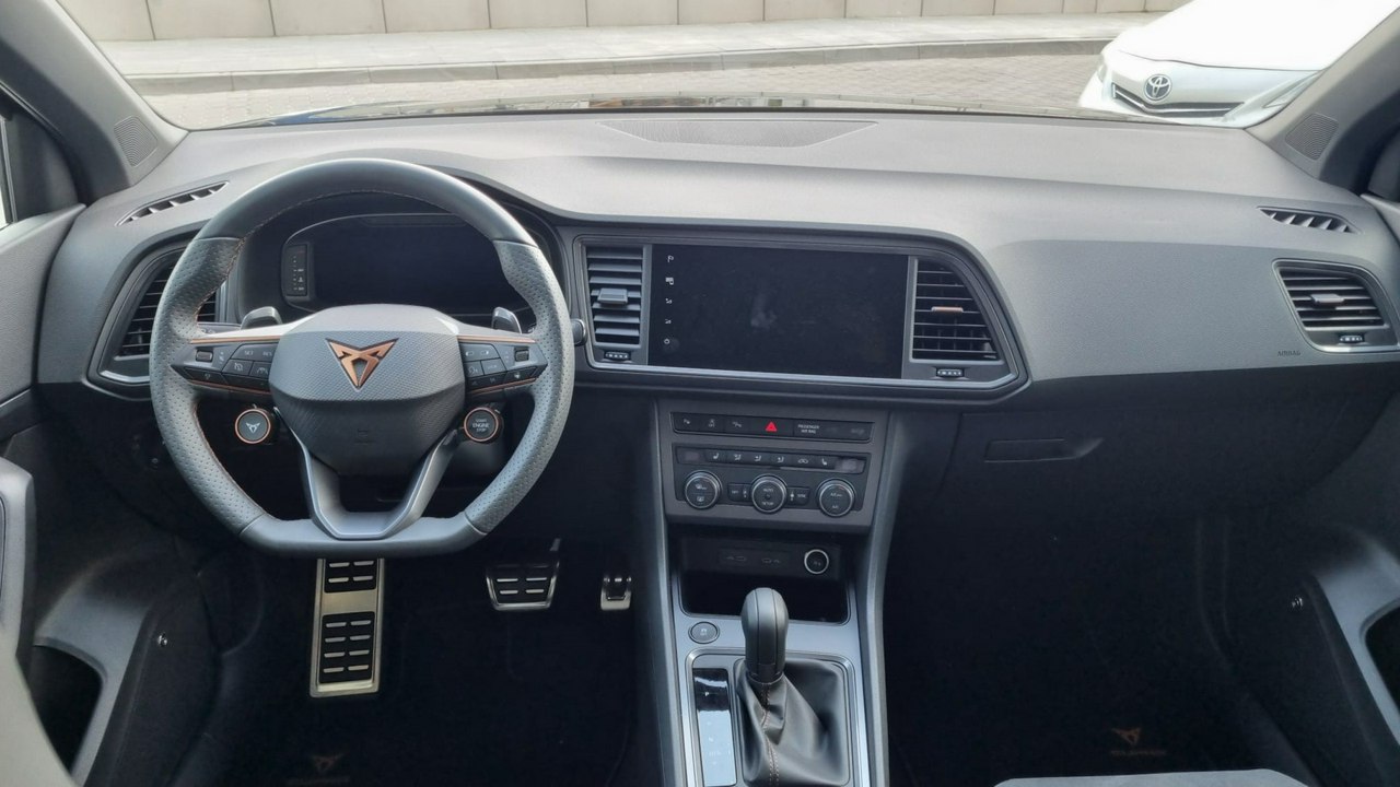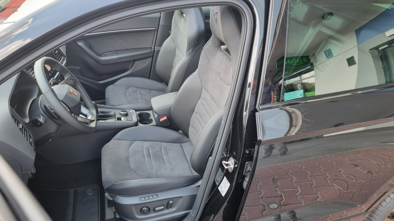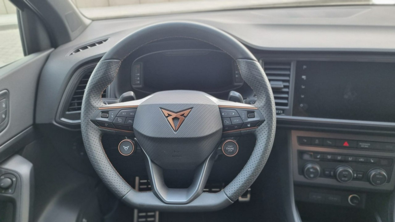- Sportowa, podgrzewana kierownica wielofunkcyjna obszyta skórą z przyciskiem trybu Cupra i uruchamiania silnika