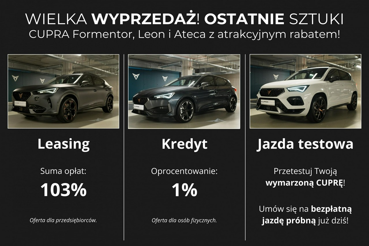 ➤ Zapraszamy do skorzystania z naszej wyjątkowej oferty promocyjnej! Nasz wykwalifikowany zespół CUPRA MASTERÓW chętnie udzieli szczegółowych informacji na temat dostępnych rabatów. Serdecznie zapraszamy do kontaktu!