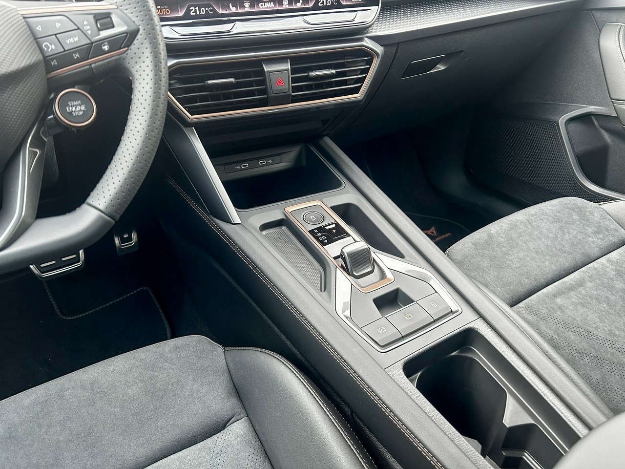 - Sportowa, podgrzewana kierownica wielofunkcyjna obszyta skórą z przyciskiem trybu Cupra i przyciskiem uruchamiania silnika