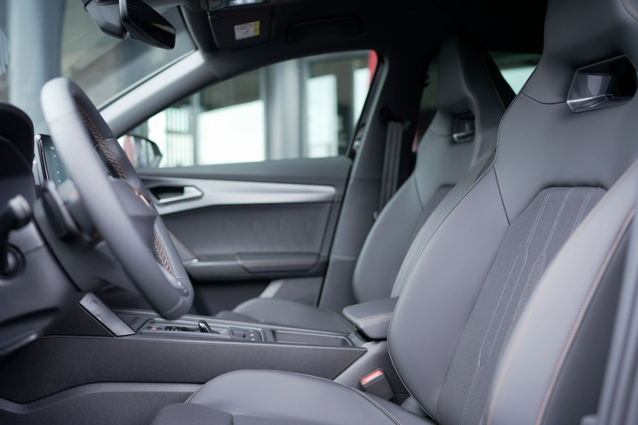 - Sportowe fotele przednie, tapicerka materiałowa ze skórą ekologiczną z przeszyciem w kolorze miedzi