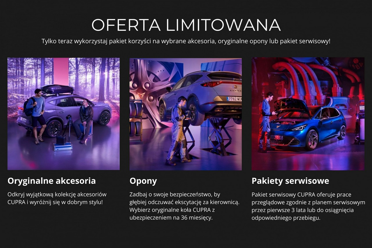 Zapraszamy do skorzystania z naszej wyjątkowej oferty promocyjnej! Nasz wykwalifikowany zespół CUPRA MASTERÓW chętnie udzieli szczegółowych informacji na temat dostępnych rabatów. Serdecznie zapraszamy do kontaktu!