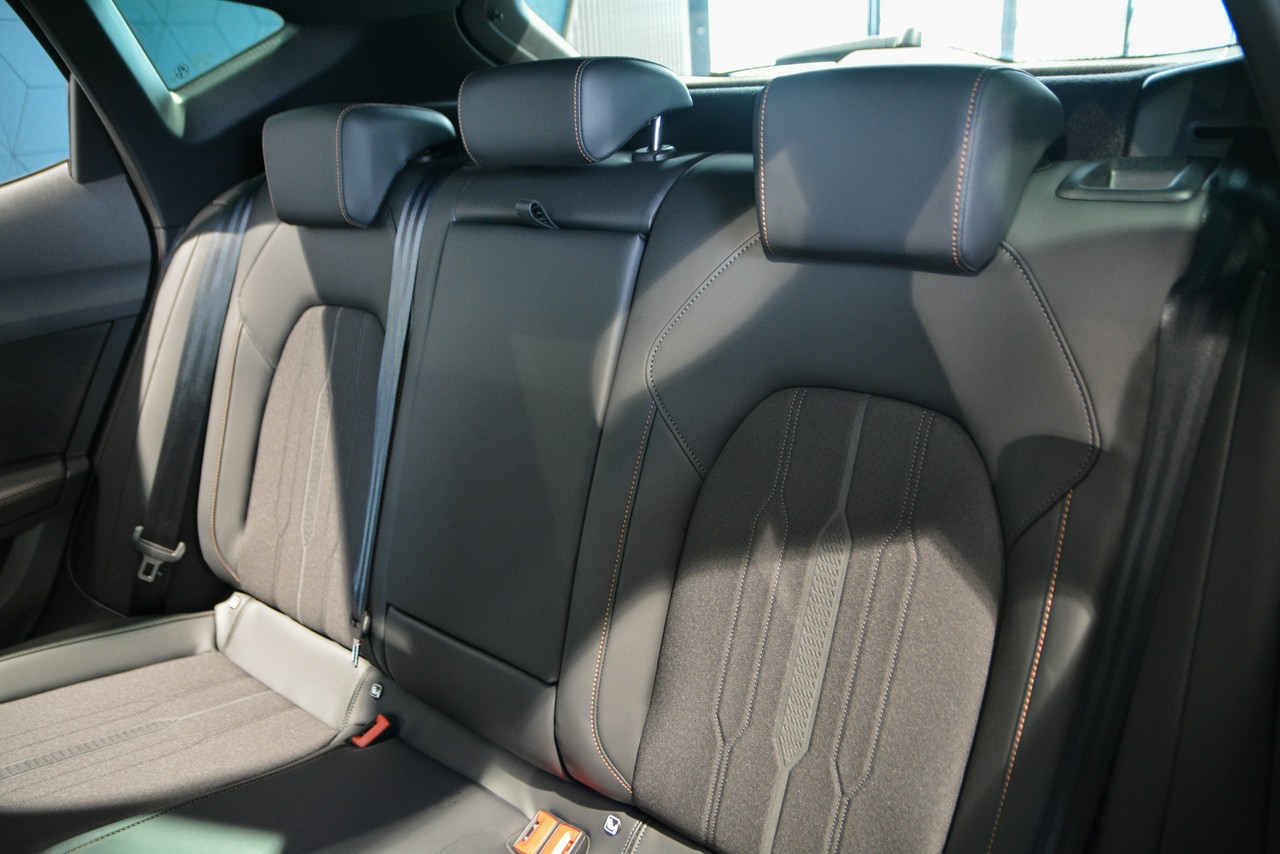 - Sportowe fotele przednie, tapicerka materiałowa ze skórą ekologiczną z przeszyciem w kolorze miedzi