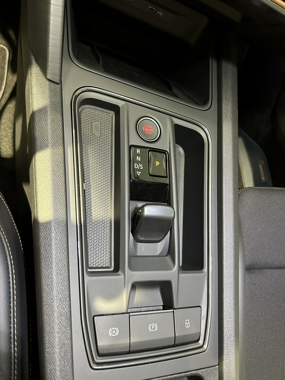 - Sportowe fotele przednie, tapicerka materiałowa ze skórą ekologiczną z przeszyciem w kolorze miedzi