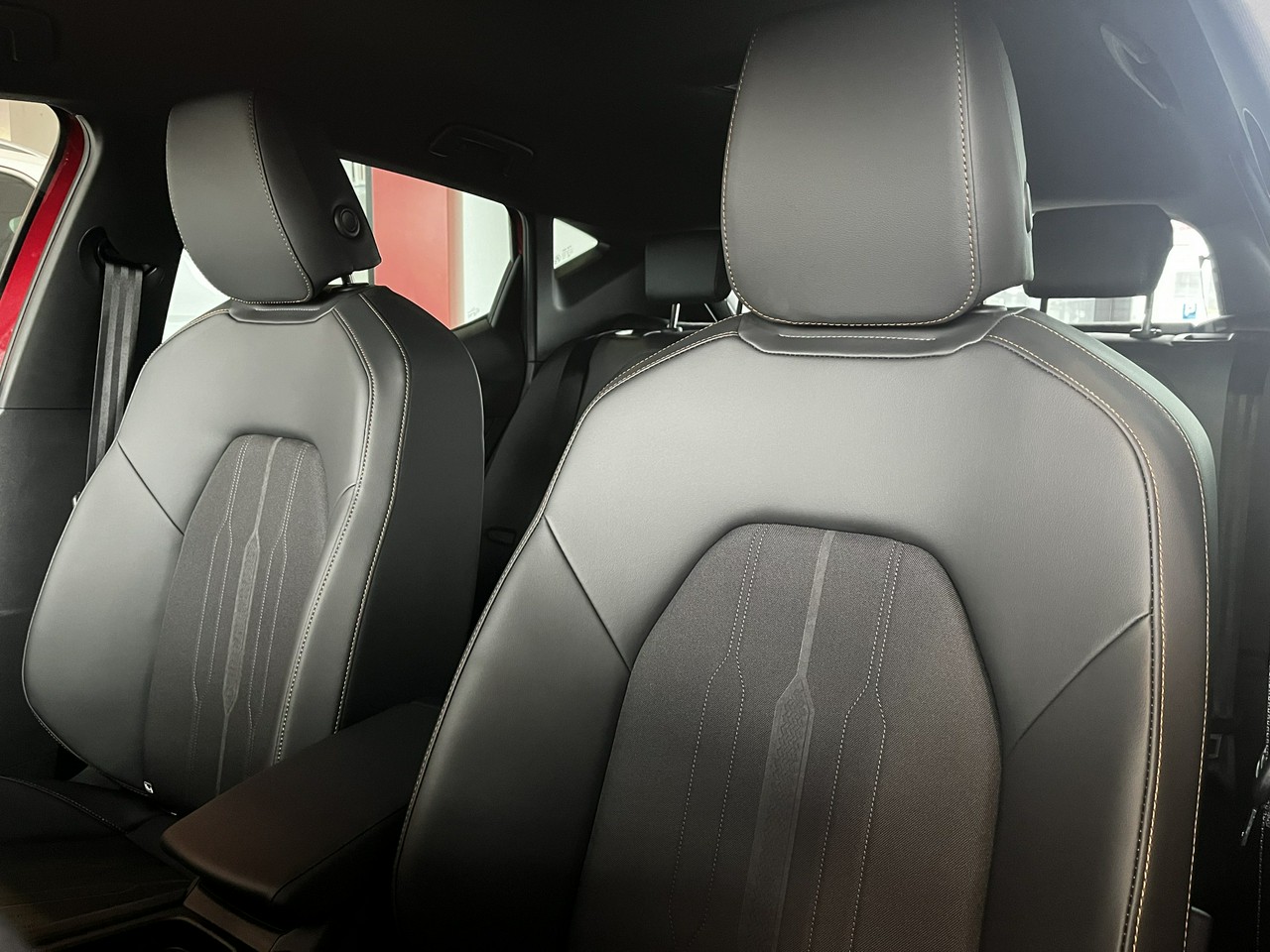 - Sportowe fotele przednie, tapicerka materiałowa ze skórą ekologiczną z przeszyciem w kolorze miedzi