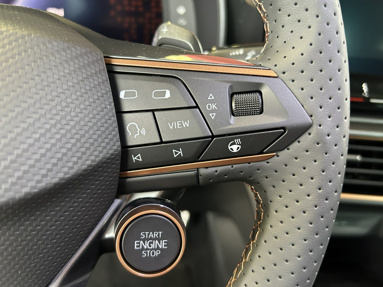 - Sportowa, podgrzewana kierownica wielofunkcyjna obszyta skórą z przyciskiem trybu Cupra i uruchamiania silnika