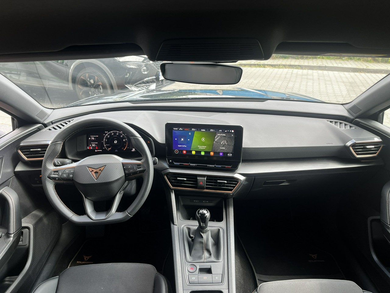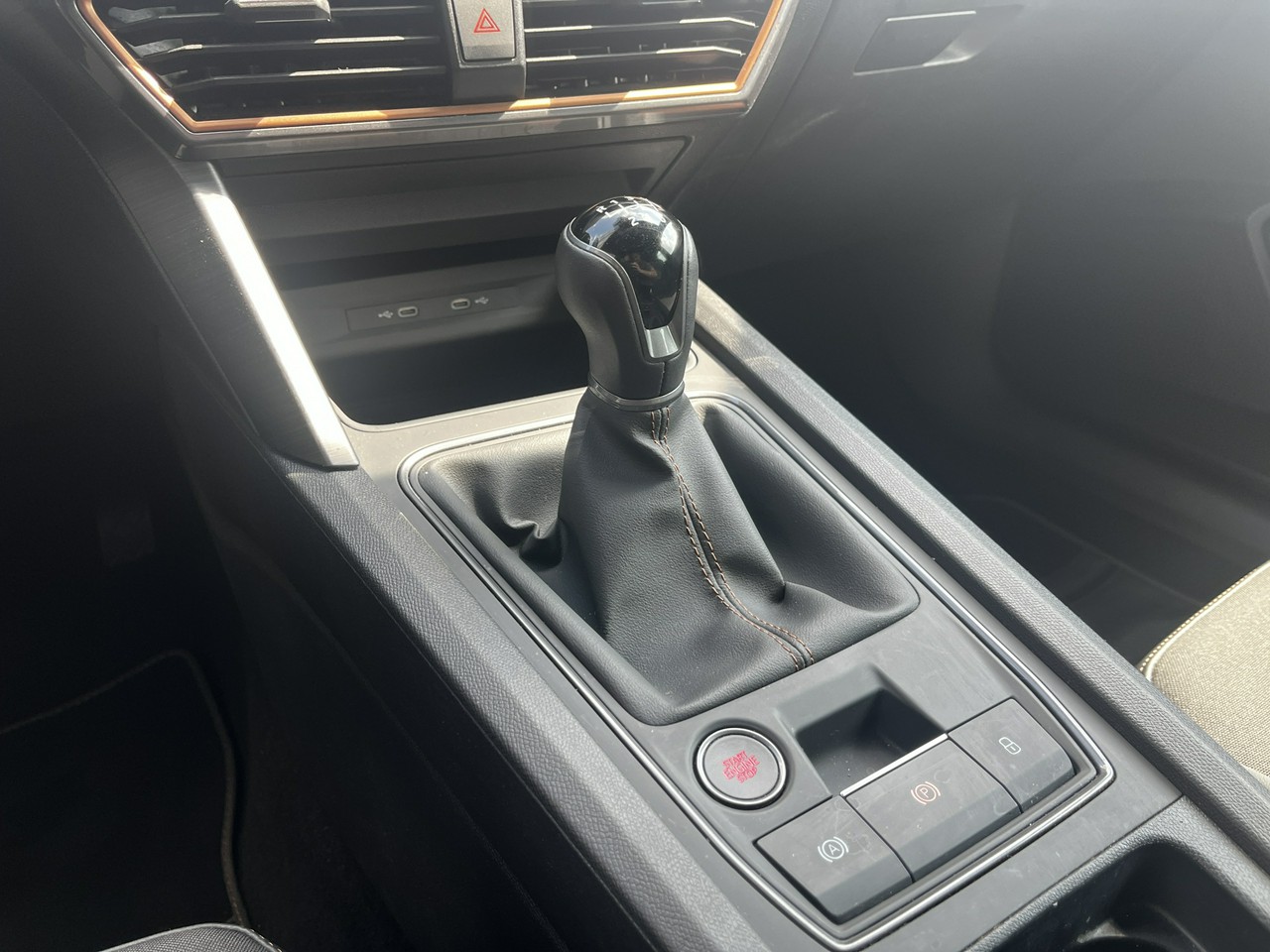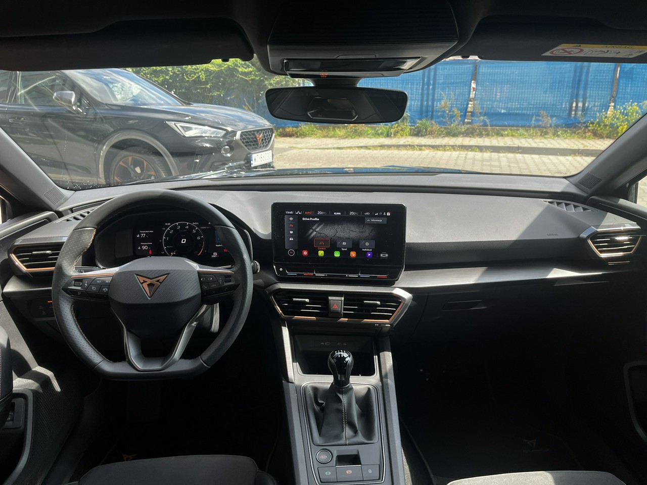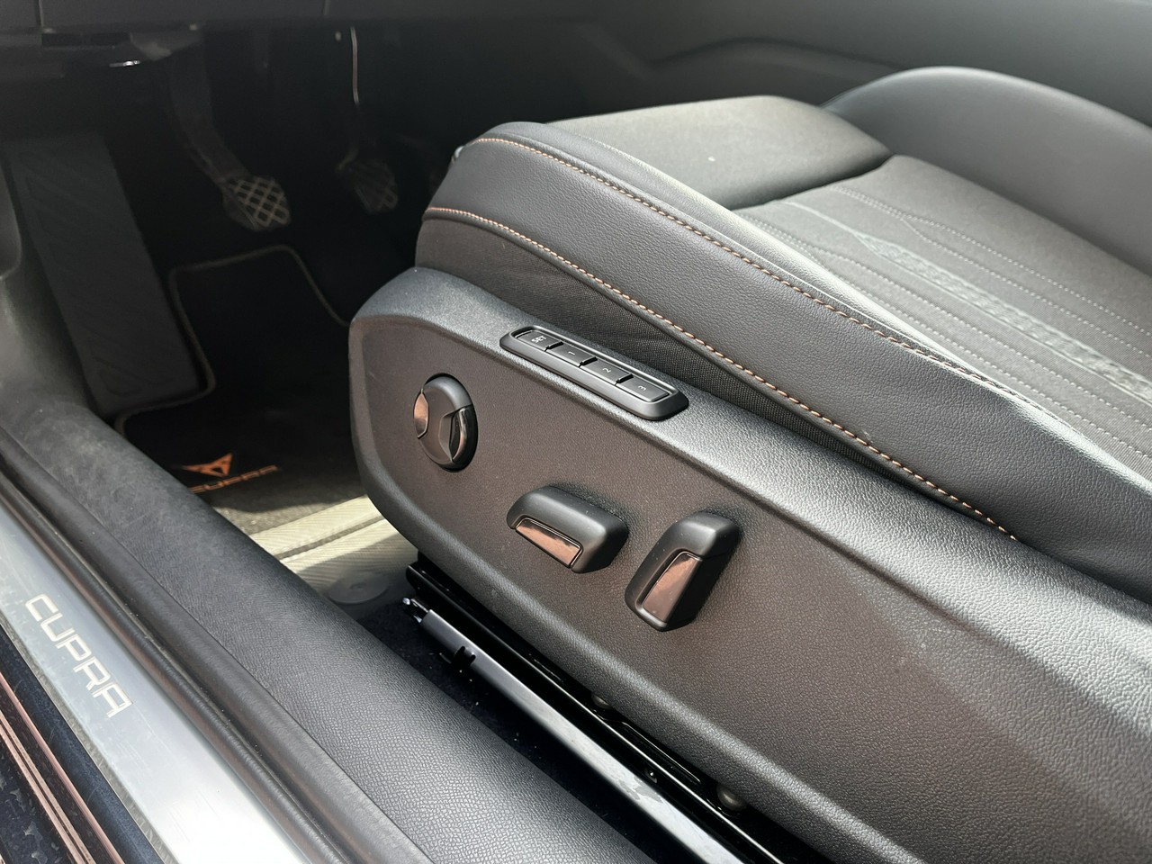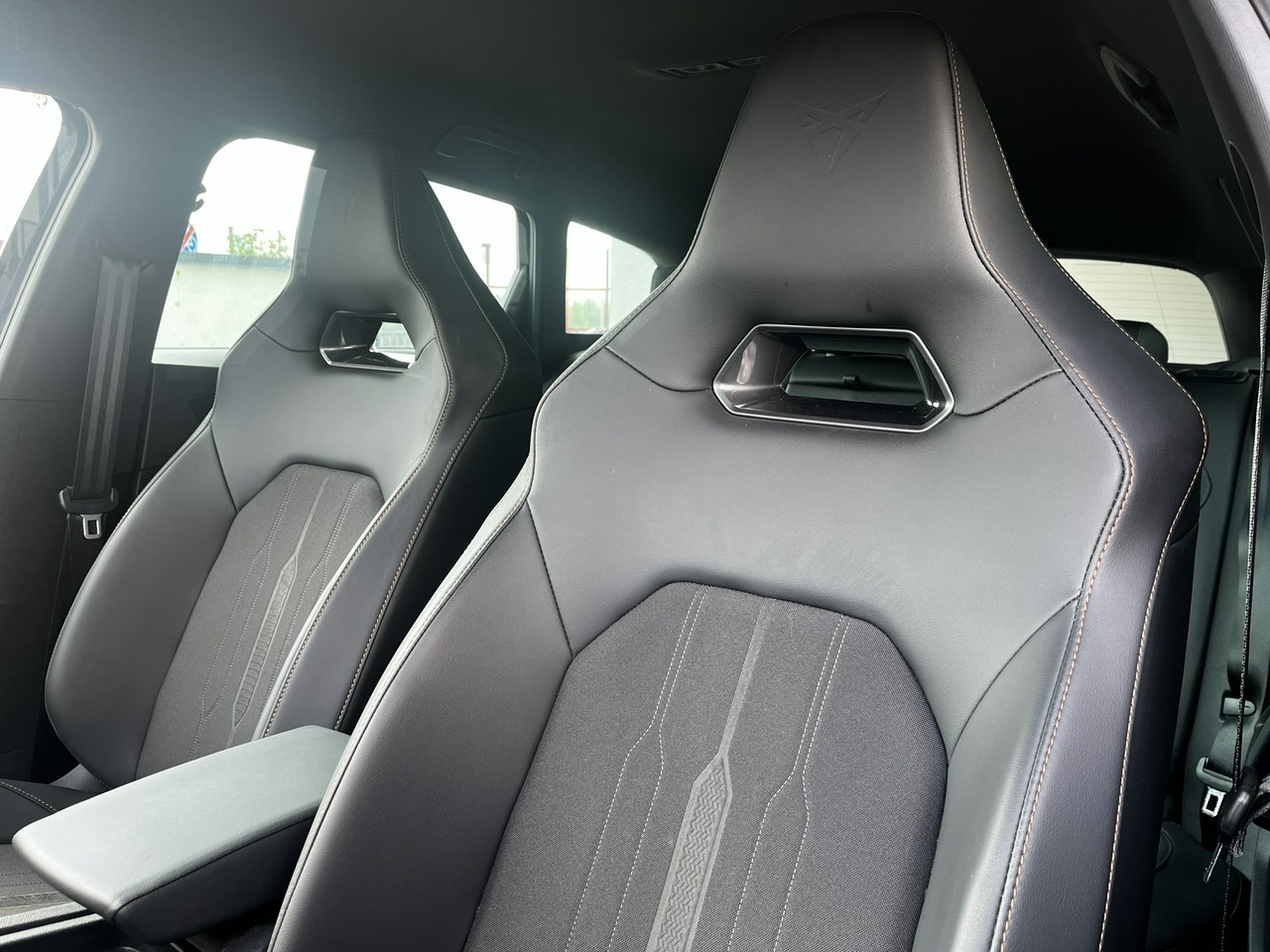 - Sportowe fotele przednie, tapicerka materiałowa ze skórą ekologiczną z przeszyciem w kolorze miedzi