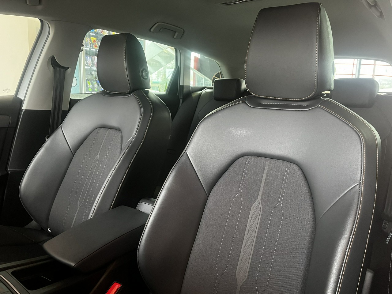 - Sportowe fotele przednie, tapicerka materiałowa ze skórą ekologiczną z przeszyciem w kolorze miedzi