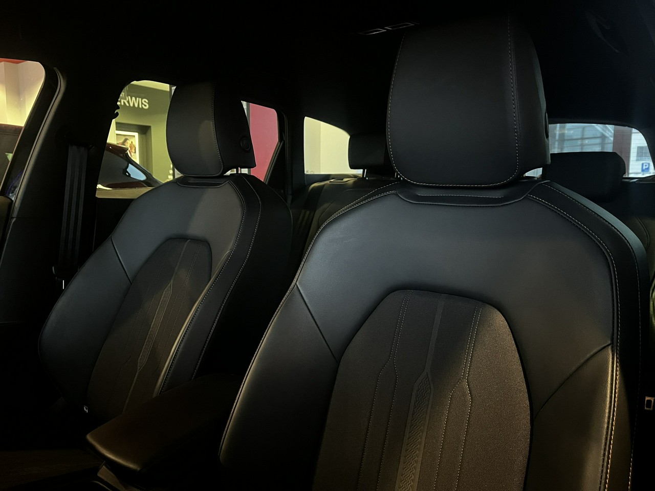 - Sportowe fotele przednie, tapicerka materiałowa ze skórą ekologiczną z przeszyciem w kolorze miedzi