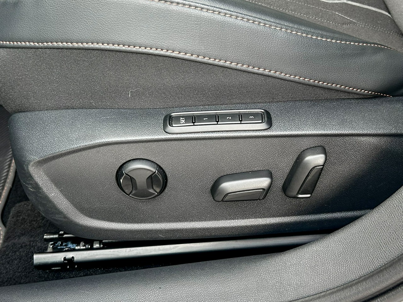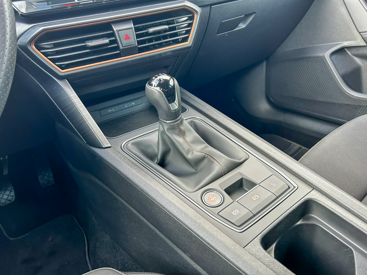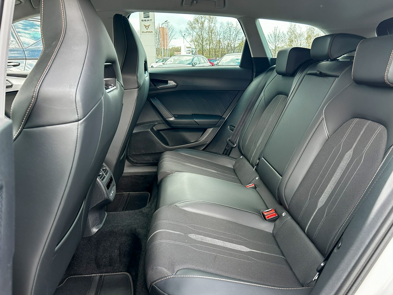 - Sportowe fotele przednie, tapicerka materiałowa ze skórą ekologiczną z przeszyciem w kolorze miedzi