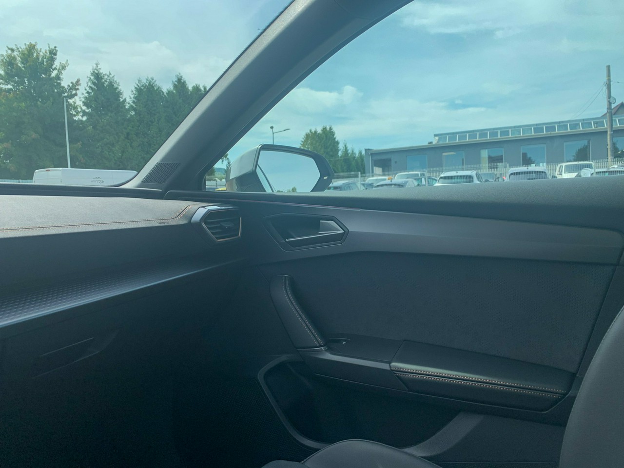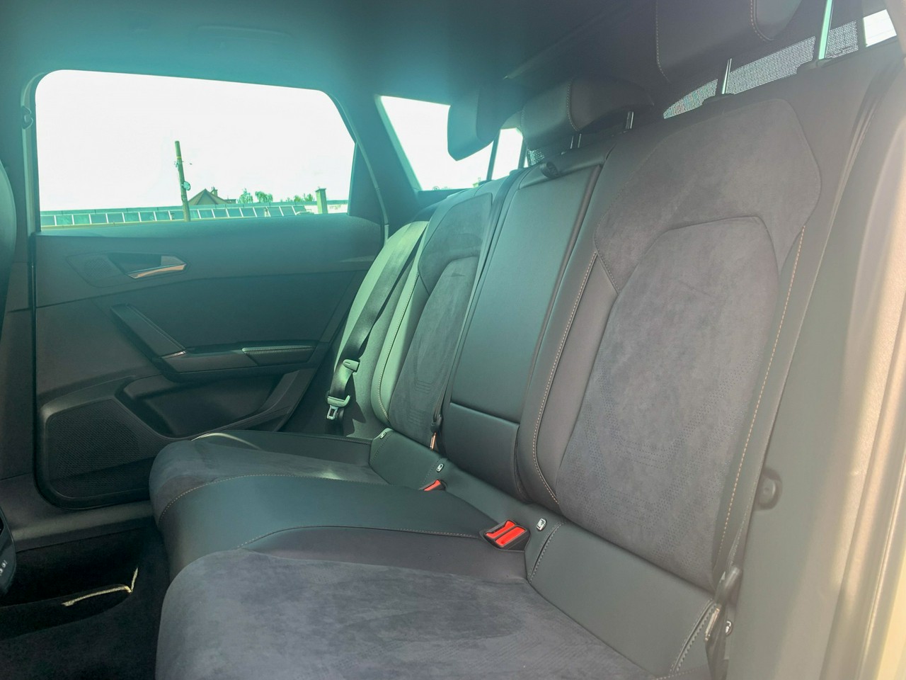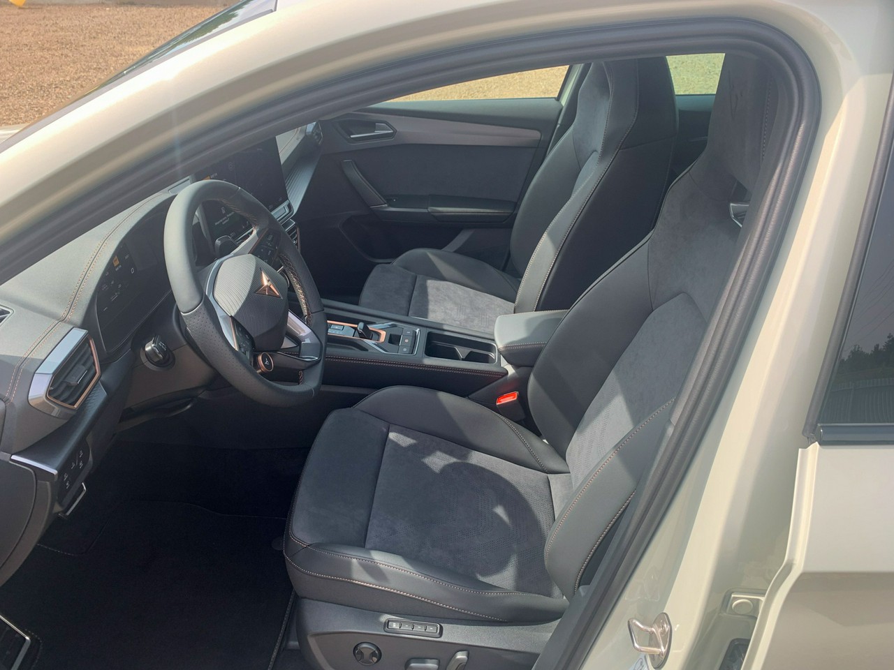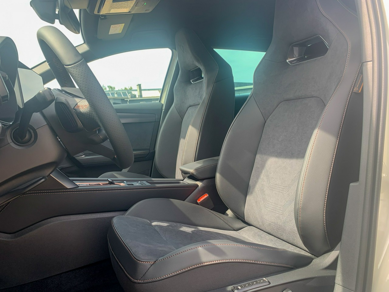 - Sportowe fotele przednie, tapicerka materiałowa ze skórą ekologiczną z przeszyciem w kolorze miedzi
