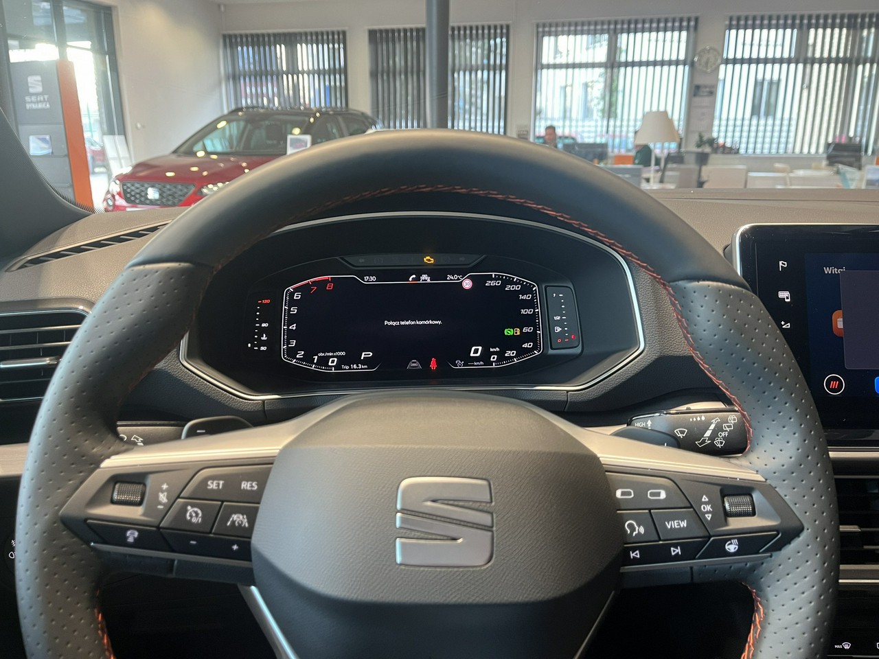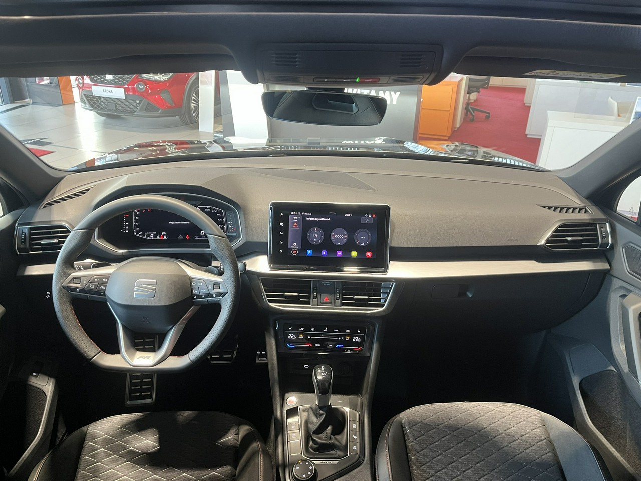 - Sportowa kierownica wielofunkcyjna z logo FR i elementy dźwigni zmiany biegów obszyte skórą z czerwonym przeszyciem