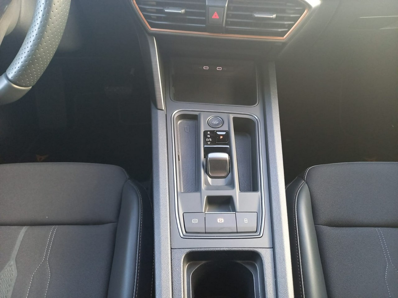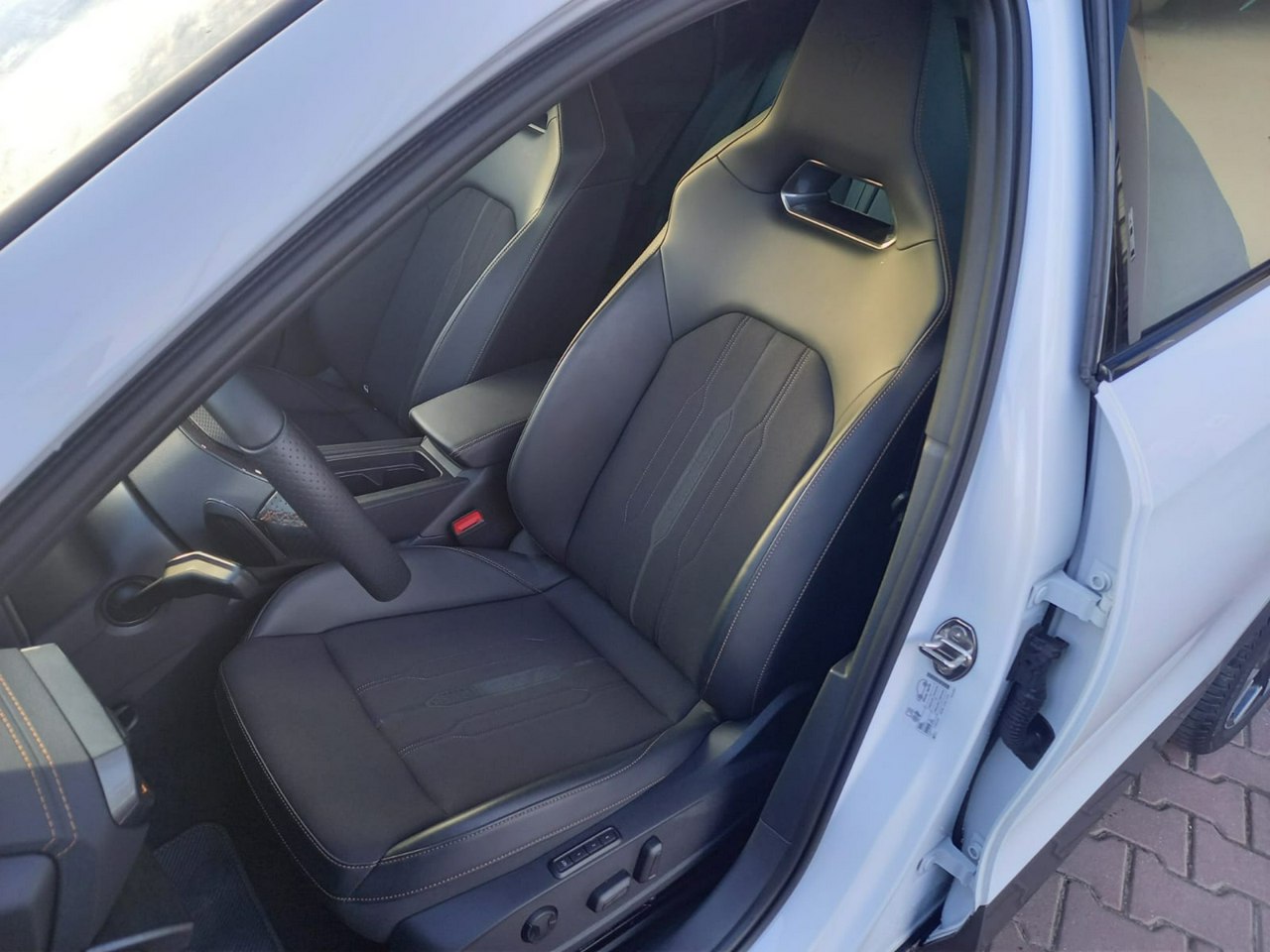 - Sportowe fotele przednie, tapicerka materiałowa ze skórą ekologiczną z przeszyciem w kolorze miedzi