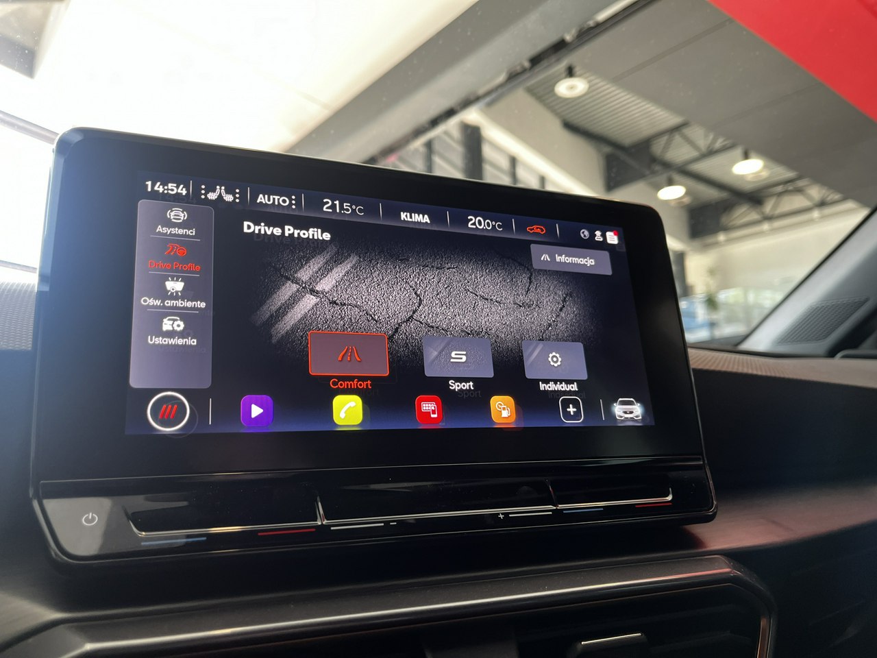 - Cupra Drive Profile: 4 profile jazdy umożliwiające zmianę reakcji silnika oraz wspomagania kierownicy